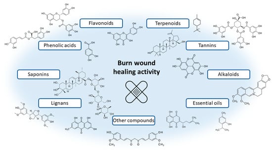 This review focuses on plant extracts and their mixtures that have been tested in animal models and clinical trials. Extracts, as mixtures of chemical compounds, can show different directions of action affecting the various stages of wound healing (Figure 1). In the inflammation phase, compounds with antibacterial, antioxidant, and anti-inflammatory effects will be particularly important. These include mainly polyphenols and flavonoid compounds, as well as essential oils [,]. They may have an antibacterial effect, as well as modulate the inflammatory response by regulating the secretion of cytokines and chemokines, such as interleukin 1β or interleukin 8, or tumour necrosis factor α (TNF-α). Studies on the effect of extracts and chemical compounds on the inflammatory phase are quite popular and there are more and more publications describing this issue []. However, less is known about the impact of individual chemical compounds on the proliferation and remodelling phase of wound healing. It is assumed that compounds from the groups of alkaloids, tannins, flavonoids and terpenes are of the greatest importance [,]. Important for the proliferative phase will be compounds that affect the formation of the extracellular matrix and stimulate re-epithelialisation, angiogenesis, or the formation of granulation tissue through, among others, stimulating cell proliferation and increasing the expression of proteins such as transforming growth factor β (TGF-β) or vascular endothelial growth factor (VEGF). Finally, in the remodelling phase, chemicals that affect, for example, stimulation of collagen deposition and elastin fibres [,] will be necessary. Thanks to the diverse mechanisms of action, potential antibacterial effect and safety of use, natural preparations compete with conventional treatment, all the more that the public’s interest in traditional medicine and herbal medicine is growing []. The chemical structures of the compounds involved in the wound-healing process are presented in Figure 2.