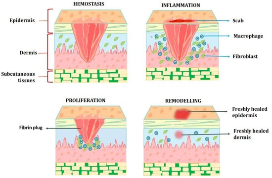 Skin wound healing is an intriguing biological process that has served mammals well throughout evolution. Skin wound healing is a crucial phase for survival that culminates in wound closure because of its essential roles as a physical, chemical, and bacterial barrier. The process of cellular, humoral, and molecular mechanisms involved in skin wound healing is dynamic, tightly regulated, and can take years to complete [12]. The epithelialisation of skin wounds depends on the details of the lesion, including its location, depth, size, microbial contamination, patient-related medical problems, genetics, and epigenetics. Following a skin injury, the exposed sub-endothelium, collagen, and tissue factor will stimulate platelet aggregation, which in turn causes degranulation and releases chemotactic factors (chemokines) and growth factors to form the clot [12]. By following all of the aforementioned steps, successful haemostasis will be achieved.