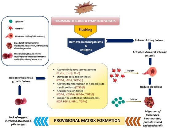 The thrombogenic sub-endothelium is initially exposed to platelets by haemorrhage into the wound. When the skin is wounded, bleeding typically occurs to help remove microorganisms and/or antigens from the wound. The main goal of the vascular mechanism is to stop exsanguination in order to maintain the integrity of the circulatory system and ensure important organs’ abilities to function unharmed despite the injury. The long-term provision of a matrix for the invasive cells that are required in the later stages of healing is the second goal. Bleeding causes haemostasis to be activated, which occurs by exudate components such as clotting factors [17]. Vasoactive chemicals such as serotonin and catecholamines work through particular endothelium receptors to constrict nearby blood vessels. Leukocytes, red blood cells, and plasma proteins can enter the body by way of smaller arteries when they are triggered to vasodilate. A local perfusion failure with subsequent oxygen deprivation, increased glycolysis, and pH alterations is explained by the life-saving vasoconstriction with clot formation. Following vasoconstriction, there is a vasodilation during which thrombocytes infiltrate the temporary wound matrix [18]. Hyperaemia, a localised redness, and wound oedema are additional signs of vasodilation. Platelets are essential to this stage, as well as the overall healing process, because, in addition to establishing early haemostasis, they also release a number of cytokines, hormones, and chemokines that initiate the subsequent stages of healing. In order to prevent further blood loss, the coagulation cascade is activated alongside haemostatic processes through intrinsic and extrinsic routes, causing platelet aggregation and clot formation. The presence of fibrinogen in the exudate triggers the clotting mechanism, which causes the exudates (blood devoid of cells and platelets) to coagulate (Figure 2). This, along with the construction of a fibrin network, results in a clot in the wound, which stops bleeding [19]. The fibrin, fibronectin, vitronectin, and thrombospondin molecules found in the blood clot serve as the provisional matrix, a scaffold for the migration of leukocytes, keratinocytes, fibroblasts, and endothelial cells as well as a source of growth factors. Additionally, this stage is where the inflammatory process starts. This stage is occasionally referred to as the “lag phase” because the organism must coordinate the recruitment of numerous cells and components for the healing process while the wound lacks mechanical strength [18,19,20].