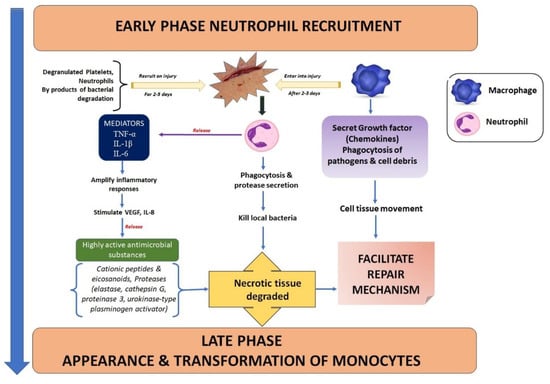 The inflammatory phase starts practically immediately after haemostasis and lasts for around 3 days, often starting as soon as a few minutes after damage and lasting up to 24 h. Through the production of histamine and serotonin, the release of protein-rich exudate into the wound produces vasodilation, allowing phagocytes to enter the wound and devour dead cells (necrotic tissue). It starts the complement cascade and sets off molecular processes that allow neutrophils, whose primary job it is to fight infection, to infiltrate the wound site. To remove bacteria, foreign objects, and injured tissue, the neutrophils must first perform the vital process of phagocytosis [21]. Within the first 24 h, many neutrophils arrive on the scene as the initial leukocytes. Macrophages quickly follow neutrophils because they are drawn to the consequences of neutrophil death. In the wound, phagocytic cells such as macrophages and other lymphocytes start to sweep away debris and microorganisms.