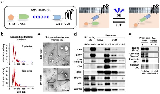 We produced and purified exosomes as previously reported [19,24]. The Expi293F cell lines with two recombinant proteins, srIκB-CRY2 and N-terminal fragment of cryptochrome-interacting basic-helix-loop-helix 1 (CIBN)-CD9, were used to produce Exo-srIκB. In particular, we used blue-light illumination to transiently combine CRY2 and CIBN (Figure 1a). The diameter of isolated exosomes was measured by NTA, and it was ranged from 50 to 130 nm as consistent with the reported size of exosomes (Figure 1b) [19]. In addition, TEM confirmed the size and shape of isolated exosomes (Figure 1c). Western blot analysis further identified the protein expression of srIκB, CRY2, and CIBN only in Exo-srIκB, but not in Exo-Naïve, while both exosomes expressed classical exosome markers, such as CD9, CD81, TSG101, Alix, and GAPDH (Figure 1d). In addition, we did not detect the expression of cell organelle marker proteins, including GM130, lamin B1, prohibitin, and calnexin, in both exosomes (Figure 1e).