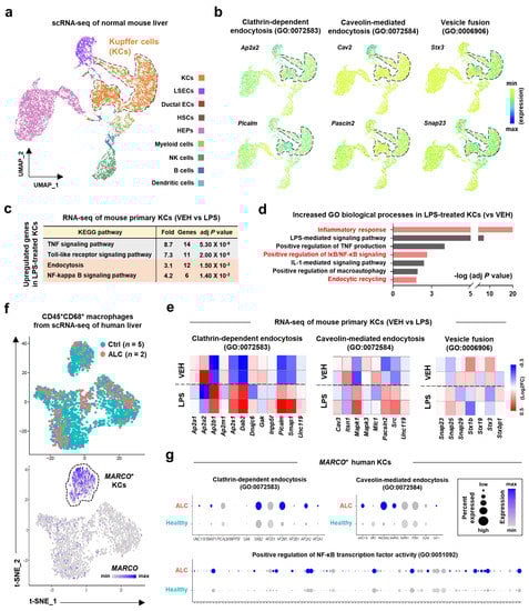 Increased expression levels of exosome uptake process-related genes in mice and human inflammatory Kupffer cells (KCs). (a,b) Single-cell RNA sequencing (scRNA-seq) of normal mouse liver (GSE132042) was analyzed. Uniform manifold approximation and projection (UMAP) presentation of feature plots for cell type annotation (a) or gene expression levels (b). (c–e) Bulk RNA-seq of mouse primary KCs (GSE86397) was analyzed. (c) Kyoto encyclopedia of genes and genomes (KEGG) pathway analysis of upregulated genes in lipopolysaccharide (LPS)-treated KCs. (d) Increased gene ontology (GO) biological processes in LPS-treated KCs were analyzed. (e) Heatmaps showed relative expression levels of genes related to indicated pathways. (f,g) scRNA-seq of the human liver (GSE136103) from healthy control (Ctrl, n = 5) or patients with alcohol-associated liver cirrhosis (ALC, n = 2) was analyzed. (f) A t-distributed stochastic neighbor embedding (t-SNE) presentation of feature plots showed annotation by group (upper) and expression level of MARCO (lower). (g) Relative expression levels of genes related to indicated pathways were analyzed in MARCO+ KCs. For RNA-seq, an adjusted p value was used.