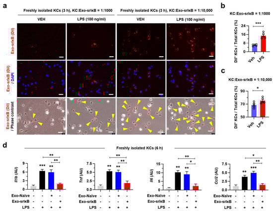 We next tried to demonstrate the efficient delivery of Exo-srIκB in KCs and its inhibitory effect on LPS-induced inflammatory gene expression levels in vitro. First, to investigate the delivery of Exo-srIκB by KCs, we labeled Exo-srIκB with DiI and treated to mouse primary KCs in time (1 or 3 h)- and dose (KC:Exo-srIκB = 1:1000 or 1:10,000)-dependent manners. Although the Exo-srIκB-laden KCs could not be detected after 1 h (Figure S1a), Exo-srIκB was delivered to about 8% of KCs at low dose (KC:Exo-srIκB = 1:1000) and 70% at high dose (KC:Exo-srIκB = 1:10,000) after 3 h of treatment (Figure 3a-c). In addition, in line with the findings in Figure 2, LPS treatment significantly enhanced the uptake of Exo-srIκB by KCs (Figure 3a–c). To explore the suppressive role of Exo-srIκB on LPS-induced inflammatory activation in KCs, we pretreated Exo-Naïve or Exo-srIκB to isolated mouse KCs followed by LPS. The qRT-PCR analyses revealed that treatment of Exo-srIκB, but not Exo-Naïve, normalized the increased expression levels of inflammatory genes (Il1b, Tnf, Il6, and Ccl2) by LPS without inducing cell death (Figure 3d and Figure S1b).