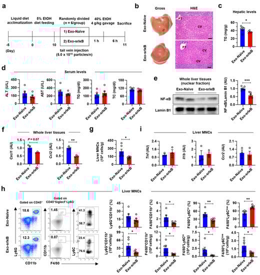 The following supporting information can be downloaded at: https://www.mdpi.com/article/10.3390/pharmaceutics15020636/s1, Figure S1: Exo-Naïve or Exo-srIκB treatment does not induce cell death of primary mouse Kupffer cells; Figure S2: A single administration of Exo-srIκB does not alter the body weight and hepatic frequencies of lymphocytes in mice with ALD; Figure S3: Three consecutive days of Exo-srIκB injection does not affect body weight and serum TG and TC levels in mice with ALD; Figure S4: Three consecutive days of Exo-srIκB injection tends to reduce the hepatic infiltration of immune cells in mice with ALD; Table S1: Primer sequences for qPCR.