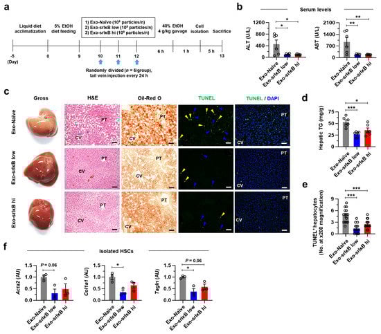 We next examined the preventative effects of multiple Exo-srIκB treatments on ALI. To do this, we fed EtOH to WT mice for 10 days and randomly divided them into 3 groups, which received 3 consecutive days of Exo-Naïve (109 particles/day/mouse), low dose of Exo-srIκB (108 particles/day/mouse), or high dose of Exo-srIκB (109 particles/day/mouse) before alcohol binge drinking (Figure 5a). At sacrifice, we found significantly reduced serum ALT and AST levels in both low-dose and high-dose Exo-srIκB injected mice compared to those of control mice with similar body weight and serum TG and TC levels (Figure 5b and Figure S3a–c). In addition, gross findings, H&E staining, and Oil Red O staining of liver tissues identified that lipid accumulation in the midzonal HEPs was markedly suppressed by Exo-srIκB treatment regardless of dosage as confirmed by hepatic TG measurement (Figure 5c,d). Moreover, TUNEL assay of liver tissue showed that Exo-srIκB treatment diminished apoptosis of HEPs and non-parenchymal cells in the midzonal area of Exo-Naïve-treated mice (Figure 5c,d). Finally, in isolated HSCs, expression levels of genes related to fibrotic activation (Acta2, Col1a1, and Tagln) were significantly reduced in the low-dose Exo-srIκB group and tended to decrease in the high-dose Exo-srIκB group compared to those of the control group (Figure 5f).