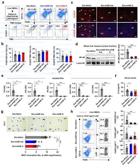 To explore the underlying mechanisms of the protective effects of Exo-srIκB in ALD, we analyzed the KCs, the major target cell type for Exo-srIκB. We first investigated the population changes in KCs since recent studies have demonstrated that in the progression of non-alcoholic steatohepatitis, there is a gradual loss of embryonic-derived KCs (emKCs) and an eventual replacement by bone marrow-derived macrophages (bmKCs) [33,34]. In particular, the above reports used CLEC2 and TIM4 as markers for emKCs (CLEC2+TIM4+), which can distinguish them from bmKCs (CLEC2+TIM4−). In flow cytometry analyses, there were no differences in the frequencies of total F4/80hiCD11b+ KCs, emKCs (CLEC2+TIM4+), and bmKCs (CLEC2+TIM4−) between the three groups (Figure 6a,b). Consistently, immunostaining of liver tissues showed a similar number of CLEC4F (a marker for both emKCs and bmKCs)-expressing cells (Figure 6c). However, in the liver tissues of Exo-Naïve-treated mice, morphological changes were found in the midzonal CLEC4F+ KCs, which disappeared by Exo-srIκB treatment, suggesting functional alterations in KCs by Exo-srIκB (Figure 6c). Indeed, we found reduced nuclear translocation of NF-κB and expression levels of pro-inflammatory genes (Tnf, Il1b, and Il6) in whole liver tissues or isolated KCs from Exo-srIκB-treated mice compared to that of control mice (Figure 6d,e). These changes were reflected in decreased serum IL-6 levels in Exo-srIκB-treated mice, although serum levels of tumor necrosis factor TNF-α and IL-1β were lower than the detection limits (Figure 6f and Figure S4a). In addition, expression levels of Cxcl1 and Ccl2 in isolated KCs and HEPs from Exo-srIκB-treated mice were decreased compared to those of control mice (Figure 6e and Figure S4b). However, although the number of F4/80+CD11b+ macrophages, F4/80+Ly6Chi pro-inflammatory macrophages, and F4/80+Ly6Clow anti-inflammatory macrophages tended to decrease by Exo-srIκB treatment by dose, there were no differences in the number of Ly6G+CD11b+ neutrophils and total isolated MNCs per gram of liver tissues (Figure S4c,d). These results were presumably derived from the loss of highly activated granulocytes during the isolation steps in Exo-Naïve-treated mice, as shown by lower frequencies of live FSChi cells in Exo-Naïve-treated mice than in Exo-srIκB-treated mice (Figure S4e). In fact, the number of MPO+ neutrophils was significantly decreased in Exo-srIκB-treated mice in the intact liver tissue, especially in the midzonal area (Figure 6g). In addition, except for the FSChi granulocytes such as Ly6G+CD11b+ neutrophils that showed similar frequencies in all groups, we could detect the diminished hepatic frequencies of F4/80+CD11b+ macrophages, particularly F4/80+Ly6Chi pro-inflammatory macrophages, and increased frequencies of F4/80+Ly6Clow anti-inflammatory macrophages in Exo-srIκB-treated mice compared to those of the control mice (Figure 6h and Figure S4e). Moreover, unexpectedly, hepatic frequencies of NK cells were reduced by Exo-srIκB treatment while the frequencies of other lymphocytes were similar (Figure S4f). Together, these results indicate the hepatoprotective effects of multiple Exo-srIκB injections in ALD mediated by suppression of inflammatory KCs.