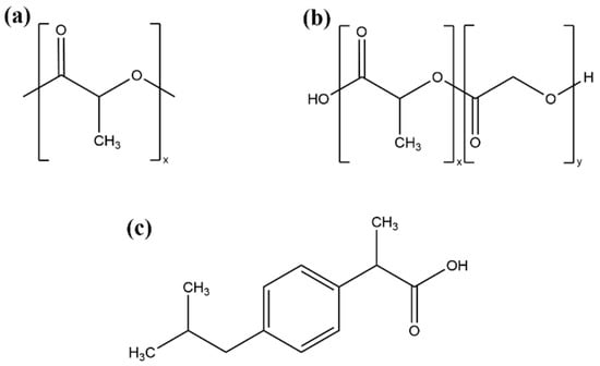 Chemical structures of used compounds: (a) PLA, (b) PLGA, and (c) IBU.
