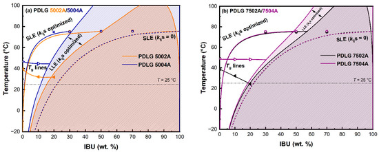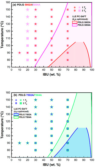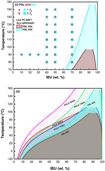 Based on the approximate areas of immiscibility regions obtained during the mapping experiments (Figure 3), the following ranking of experimental miscibility of the polymers studied with IBU can be deduced: PDL 04A > PDL 02A > PDLG 7504A > PDLG 7502A > PDLG 5002A > PDLG 5004A. Considering these results, the impact of the polymer composition is clearly visible: the higher LA content, the smaller LLE region (i.e., the higher mutual miscibility of IBU and polymer). At the same time, the impact of the molecular weight of the polymer is not as obvious. In the case of IBU–PDL 04 and IBU–PDLG 7504A systems, the determined LLE region was noticeably smaller compared to the systems of IBU with lower molecular weight analogs (i.e., PDL 02A and PDLG 7502). Hoverer, the situation with PDLG 5002A and PDLG 5004A (i.e., LA to GA ratio 50:50) was the opposite.