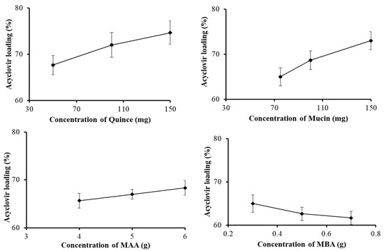 The increase in drug loading by increasing the feed contents of quince, mucin and MAA might be attributed to an increase in the gelling contents of the fabricated hydrogel, which results in an increase in the retention of acyclovir sodium within the polymeric network. In case of an increase in the contents of MBA, drug loading decreases, which might be due to an increase in the internal stretch of the polymeric chains. These results comply with previously reported studies [44].
