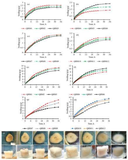 Hydrogels possessing a high profound swelling capacity and a rapid rate of swelling are preferred when designing drug delivery systems [45]. In order to estimate the pH sensitivity of the quince/mucin co-poly (methacrylate) hydrogel, the swelling response of different formulations (QHM1–QHM12) were determined in a phosphate buffer with a pH of 7.4 and an acidic buffer with a pH of 1.2. A high swelling profile was witnessed for all formulations in the phosphate buffer with a pH of 7.4, as shown in Figure 2e–h, whereas minor swelling was observed in the acidic buffer with a pH of 1.2, as shown in Figure 2a–d. Moreover, in the phosphate buffer (pH 7.4), it was noticed that a sequential rise in the ratios of quince and mucin in the formulations QHM1–QHM6 resulted in increased swelling from 10 to 13 g/g and from 8 to 10 g/g, respectively. This increase in swelling by increasing quince and mucin is attributed to an increase in hydroxyl and carbonyl groups within the polymeric chains. Due to this increment, repulsive forces within the polymeric chains become more pronounced, allowing more physiological fluid to penetrate into the matrices and resulting in enhanced swelling.