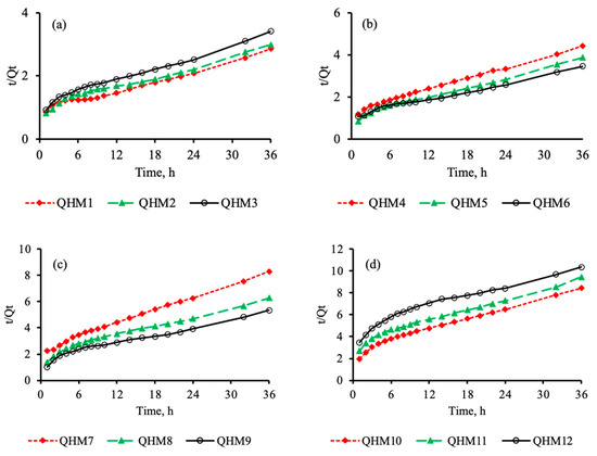 Second-order swelling kinetics is confirmed if the graph between t/Qt vs. t on the y-axis and the x-axis, respectively, is linear [22].