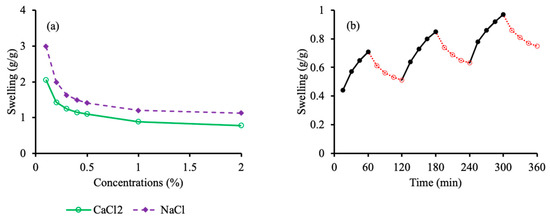 The swelling behavior of the fabricated hydrogel discs was ascertained in aqueous salt solutions of NaCl and CaCl2. Solutions with different molar concentrations (0.1, 0.2, 0.3, 0.4, 0.5, 1.0 and 2.0 M) were prepared. The equilibrium swelling of the hydrogel discs rapidly declined as the molar concentration of the salt solutions was increased from 0.1 to 0.4 M. Afterward, a less steep response was noticed from 1.0 to 2.0 M solutions. This decrease in swelling with increasing concentration of electrolytes is attributed to the charge screening effect of the counter ions and a decrease in the osmotic pressure difference between the hydrogel and the salt solution [48]. Electrolyte swelling is depicted in Figure 4a. It is quite evident that the hydrogel discs exhibit lesser swelling in the CaCl2 solution compared to the NaCl solution at the same concentration. This might be attributed to the higher affinity of calcium ions toward their counter ions that are present in the polymeric chains.