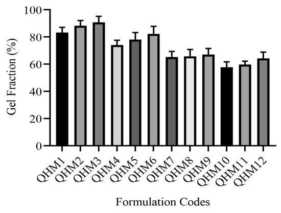 To establish the effect of quince, mucin, MAA and MBA on the sol and gel fraction (%) of the fabricated hydrogel, the discs with different formulations (QHM1–QHM12) were immersed in deionized water at 37 °C for 36 h. The rise in the gel fraction from 85 to 95% with increasing QH is evident in formulations QHM1–QHM3, as displayed in Figure 5. A similar tendency was witnessed when the amount of mucin was increased. In this case, the gel fraction increases from 75 to 85% in the formulations QHM4–QHM6. A subsequent rise in the gel fraction from 65 to 68% was witnessed in the formulations QHM7–QHM9 with increasing concentrations of MAA. This rise in the gel fraction with increasing concentrations of polymers and monomers could be attributed to an increase in carbonyl groups, leading to an increase in reactive sites on the polymers. The subsequent escalations in reactive sites lead to a stronger interaction between the polymers and the monomers, and thus the gel contents are augmented. Likewise, in formulations QHM10-QHM12 by increasing MBA contents gel fraction was pronounced from 57.66% to 64.33%. This was due to higher crosslinking density of the network due to incremental rise of MBA contents.