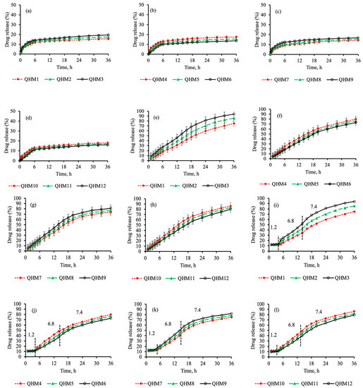 Drug release (%) of the formulations (QHM1-QHM12) in an acidic buffer with a pH of 1.2 (a–d), in a phosphate buffer with pH of 7.4 (e–h), and in a condition that mimics the pH of different segments of the intestine (i–l).