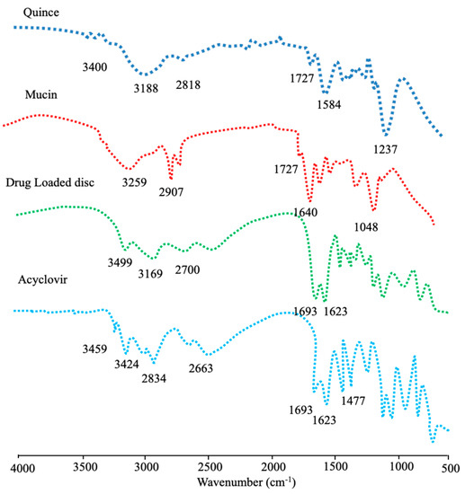 Fourier-transform infrared (FTIR) spectroscopy was used to evaluate the possible interaction of the drug with the used polymers and monomers. This was accomplished using the KBr pellet method on an IR prestige-21 (Shimadzu, Japan). The pellets of the polymers, the unloaded hydrogel discs, the loaded discs and the drug were prepared in a hydraulic press. The drying of the pellets was performed in an oven at 50 °C for 2 h. The spectra were recorded in the transmittance mode from the wavenumber (4000–500 cm−1) [28,29].