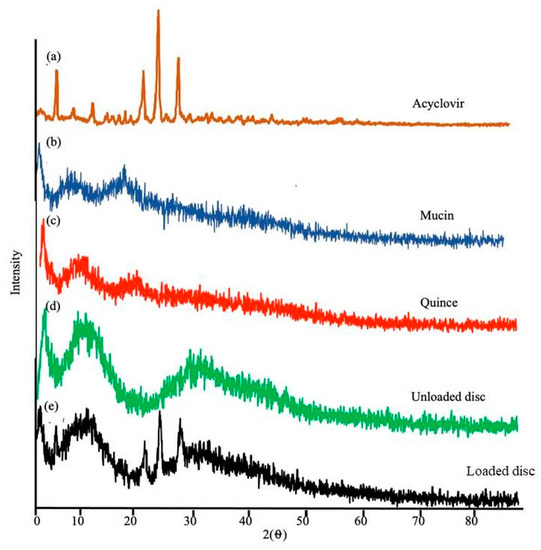 Powdered X-ray diffractograms of acyclovir sodium (a), mucin (b), quince (c), unloaded disc (d) and loaded disc (e).