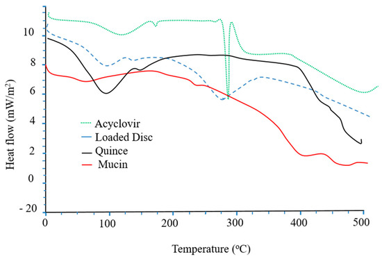 The thermal stability of the hydrogel discs, as well as the polymers and acyclovir sodium before and after loading in the hydrogel discs, was tested using differential scanning calorimetry (DSC). The DSC of acyclovir sodium shows two peaks; an initial endothermic peak at 120 °C due to the loss of moisture from the drug, while the second endothermic phase transition at 260 °C pertains to the melting point of acyclovir sodium [47]. The DSC of the QH exhibits an initial endothermic peak at 100–150 °C (Figure 10). Two phases of thermal degradation are evident in the DSC of the QH. In the first phase of degradation, an endothermic peak appears at 200–400 °C, while the second stage is witnessed at 400–600 °C. This degradation is due to the decomposition of residual cellulose [48]. In the DSC of mucin, endothermic peaks appear at 100 °C and at 250–400 °C. These peaks pertain to moisture loss and breakage of glycosidic linkage of the polymeric chain, respectively. The DSC thermogram of the drug-loaded formulation indicates a shifting of the endothermic peaks toward a higher temperature, which reflects the improved thermal stability of the formulation compared to the individual components.