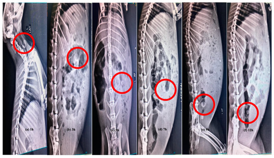 After the oral administration of the quince/mucin co-poly (methacrylate) hydrogel discs to the white albino rabbits, radiographical images were captured to investigate the physical condition of the hydrogel disc during transit from the GIT. During the 12 h study period, the passage of the hydrogel disc through different segments of GIT, i.e., stomach, small intestine and colon, is evident. During the first hour, sharp and bright images of the disc show no sign of disintegration, as well as no visible sign of swelling, indicating that the disc is intact in the stomach of the rabbit. The images captured after 4–5 h depict an increase in the size of the disc, accounting for the swelling of the disc within the upper part of the small intestine. After 9 h, the radiographical image clearly indicates the presence of the disc in the large intestine, where the size of the disc increases due to swelling. After 12 h, the presence of the disc is evident in the colon of the rabbit (Figure 11), where it is quite evident that the disc is still intact and still possesses the same integrity to provide drug release for a prolonged period of time.