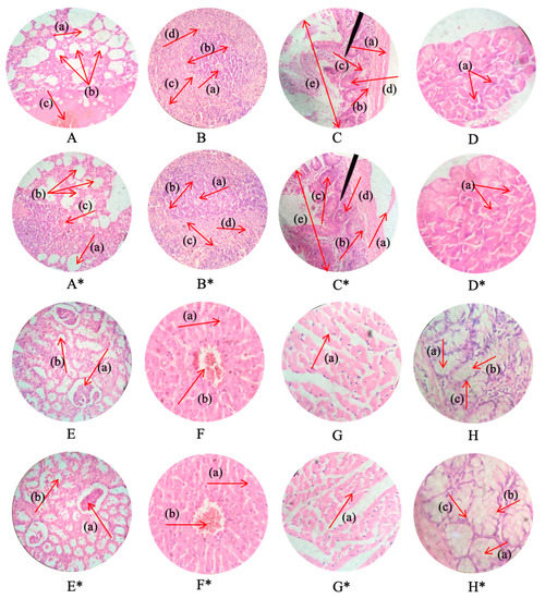 Histopathology of lungs (A,A*): alveolus (a), alveoli (b), and blood vessels (c). Spleen (B,B*): central arteriole (a), white pulp (b), red pulp (c), and trabecular (d). Small intestine (C,C*): lamina propria (a), muscularis mucosae (b), acinous lumen (c), columnar epithelial cell with basal nuclei (d), and small intestinal villi (e). Pancreas (D,D*): pancreatic acini (a). Kidney (E,E*): glomerulus (a) and renal tubules (b). Liver (F,F*): plates of hepatocytes (a) and blood vessels (b). Heart (G,G*): cardiac muscle fibers (a). Colon (H,H*): lumen of crypt (a), colon crypt (b), and lamina propria (c). A*,B*,C*,D*, E*,F*,G* and H* represent the histopathological images of the lungs, spleen, small intestine, pancreas, kidney, liver, heart, and colon of the treated animals. All images were captured at 40x magnification.