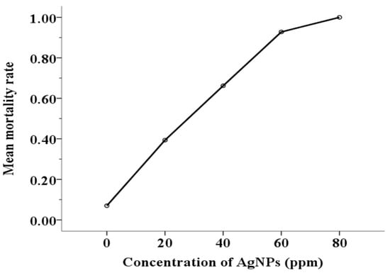 Mean mortality rates for the control and four treatment groups (20, 40, 60, and 80 ppm AgNPs).