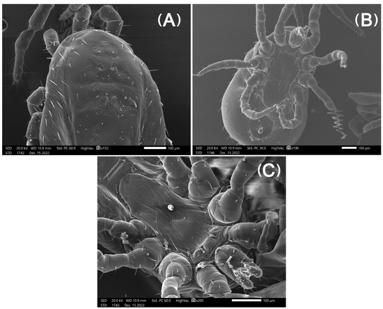 Micrographs of Dermanyssus gallinae after freezing them at (−20 °C) for 1 day: dorsal (A) and ventral (B,C) views. Exoskeletons and limbs are intact with no visual deformities.