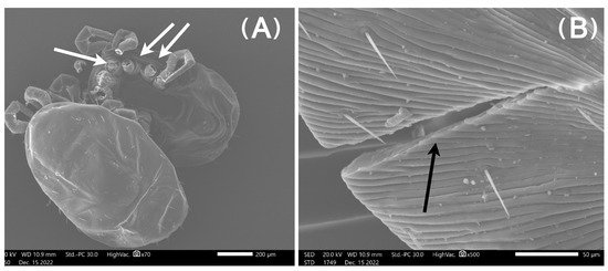 Micrographs of Dermanyssus gallinae after bioassays with AgNPs at 80 ppm for 1 day: (A) There are visible leg detachments (white arrows) and (B) considerable cracks throughout their exoskeleton (black arrow).