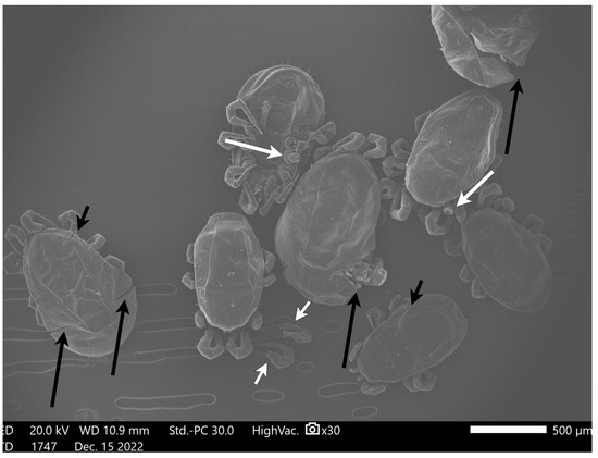 Micrograph of Dermanyssus gallinae after bioassays with AgNPs at 80 ppm for 1 day. There are numerous visible leg detachments (white arrows) and considerable cracks throughout their exoskeleton (black arrows).