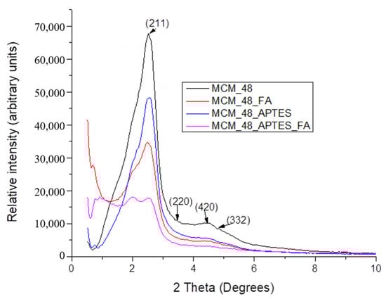 The X-ray diffractograms obtained for MCM-48 based materials, Figure 3, present the characteristic (211) peak at 2.52°, while the other three important peaks, (220), (420) and (332) are positioned at higher 2Θ values. This arrangement is characteristic to the cubic structure of MCM-48 [58]. The X-ray diffraction data obtained for MCM-48 materials functionalized with APTES, indicates a slight shift of the peak corresponding to the (211) crystallization plane [57,59] due to the formation of a silica layer on the surface and in the pores of the mesoporous material as a result of the reactions of hydrolysis and condensation occurring during functionalization reaction. At the same time, the pores of the mesoporous material decrease in size.