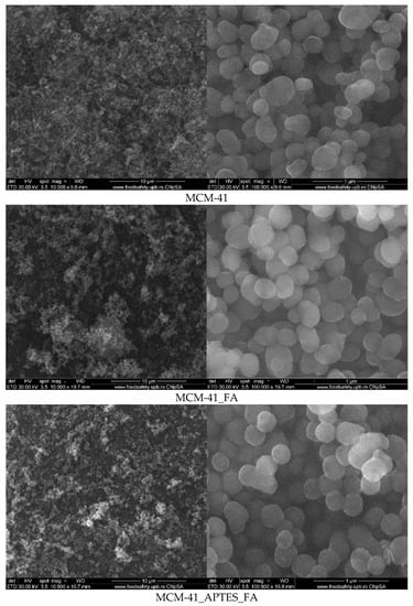 SEM micrographs (Figure 6) recorded for the mesoporous materials based on MCM-41 indicate that particles have variable size of hundreds of nanometres and a spherical morphology. When compared to the bare MCM-41, SEM images of MCM-41_FA and MCM-41_APTES_FA show some minor heterogeneities on the external surfaces of the mesoporous silica spheres, which can be attributed to the deposition of ferulic acid. Considering their incidence, and low content, it can consider that the ferulic acid (FA) is mostly deposited into the pores of the mesoporous materials. At high magnification (100,000×), it could be clearly observed that the SEM images of the MCM-41 sample were more translucent compared to the samples modified with APTES or loaded with ferulic acid (FA). These observations are in good agreement with the XRD and FTIR data, but also with the BET analysis [35].
