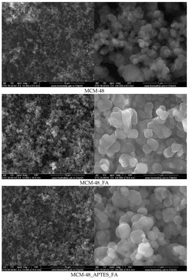 SEM micrographs (Figure 7) recorded for the mesoporous materials based on MCM-48 indicate the presence of quasi-spherical silica particles with sizes in the 150–400 nm interval. In addition, similarly to MCM-41 based samples, we can consider that FA is mainly loaded inside the pores.