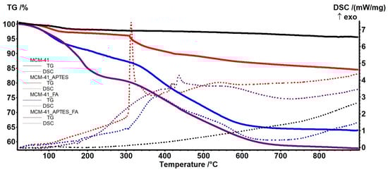 The TG (solid)—DSC (dotted) curves for the MCM-41 (black); MCM-41_APTES (red); MCM-41_FA (blue) and MCM-41_APTES_FA (purple).