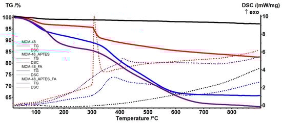 The TG (solid)—DSC (dotted) curves for the MCM-48 (black); MCM-48_APTES (red); MCM-48_FA (blue) and MCM-48_APTES_FA (purple).