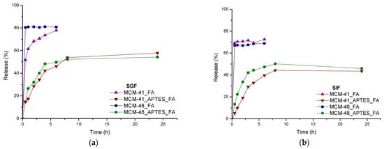 Release profiles for FA from the MCM-41_FA; MCM-41_APTES_FA; MCM-48_FA; MCM-48_APTES_FA samples in SGF (a) and SIF (b).