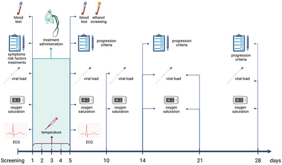 Study visits were scheduled from the day-1, or baseline visit, when the subject received the study medication or placebo for the first time. The duration of participation was 28 days divided into 8 visits on days 1, 2, 3, 5, 10, 14, 21 and 28. Data were recorded into the web application Research Electronic Data Capture (REDCap) (Vanderbilt University, Nashville, TN, USA), as shown schematically in Figure 1. On day 1, data related to risk factors, symptoms and chronic treatments were collected. Disease progression was assessed according to the modified World Health Organization (WHO) Clinical Progression Scale (Table S2) on days 5, 14 and 28, as well as hospital admissions, and duration of hospitalization. SpO2 was registered on days 1, 5, 10, 14, 21 and 28, while temperature and antipyretic treatment were registered once daily on each day of experimental treatment administration.