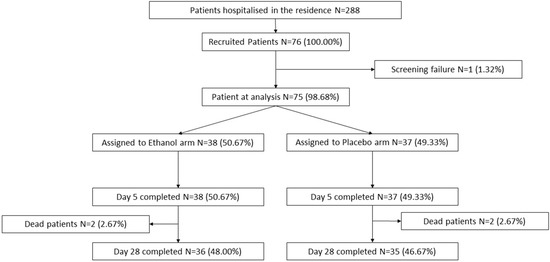 A total of 7 patients (19.4%) in the ethanol group and 6 (16.7%) in the placebo group required hospital admission. The median time from study inclusion to hospitalization was 6 days (IQR: 3.0–9.0) and 6.5 days (IQR: 4.0–7.0), respectively. The average days of hospitalization were 10.5 (SD: 7.1) in the ethanol group and 8.5 (SD: 8.5) in the placebo group, although this difference was not significant. Two patients died in each group, in the ethanol group before day 14, while in the placebo group they died between days 14 and 28.