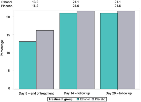 Corticosteroids were prescribed in 19 patients in each group (ethanol 50.0%; placebo 51.4%). The median time in days from study inclusion to initiation was 1.0 (IQR: 0.0–0.4) in the ethanol group and 2.0 (IQR: 0.0–0.4) in the placebo group, without statistical differences. Once started, the mean duration of treatment was 19.7 (SD: 13.4) and 15.5 days (SD: 11.6), respectively, also without statistical significance. Equivalent doses of prednisone/day and the total equivalent doses of prednisone are shown in Table S13.