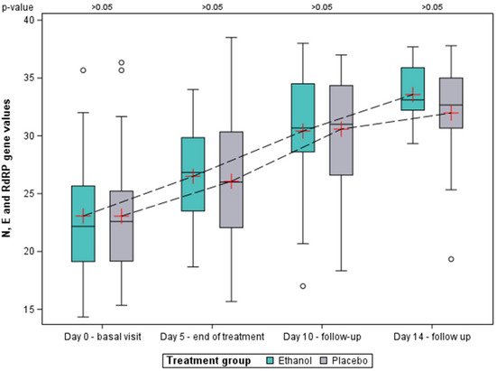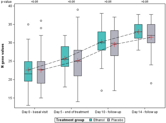 Similar behavior was observed with the N gene (Figure 5). In this case, no differences were found between groups at the baseline visit either, while the mean Ct values in the ethanol group were always numerically higher with respect to the placebo group for the study visits on days 5, 10 and 14. At day 14, the mean Ct value of the N gene in the ethanol group was 33 (95% CI: 30.8–35.2), while for the placebo group it was 31.5 (95% CI: 28.9–34.1). Despite this, statistical significance was also not reached for any of the study visits.