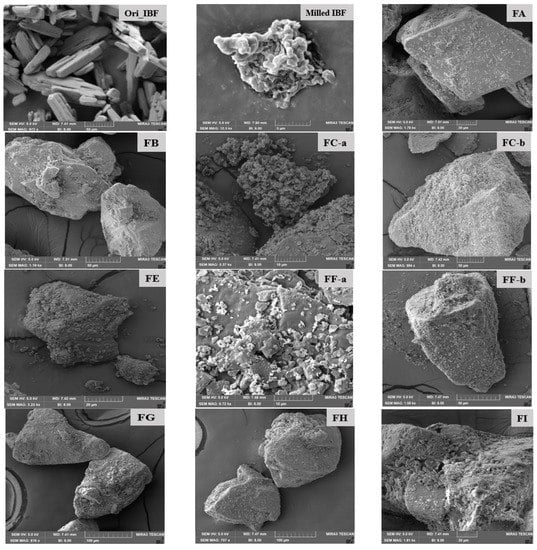 SEM images of original ibuprofen, milled IBF, and developed DPI formulations (FA, FB, FC-a, FC-b, FE, FF-a, FF-b, FG, FH, FI, FD, FJ and FK).