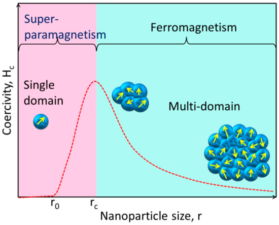 Unlike their bulk counterparts, magnetic NPs have completely distinct magnetic properties. A huge number of magnetic domains make up the majority of ferromagnetic materials, and each domain has parallel magnetic moments that are isolated by domain walls [40]. Domain walls arise when magnetostatic energy and domain-wall energy are in equilibrium [41,42]. The domain-wall energy is responsible for the larger interfacial area between domains, and the magnetostatic energy grows proportionately with the volume of the material [43]. The energy required to create domain barriers is substantially more than the magnetostatic energy required to maintain a single-domain NP; hence, there is a critical value below which a stable single-domain NP can be established when the size of ferromagnetic materials is lowered to the nanoscale level [44]. As illustrated in Figure 2, the critical size (rc) of an NP may be stated according to Equation (1) when the magnetostatic energy is equal to the domain-wall energy and the NP is transitioning from the multidomain state to the single-domain state [45].