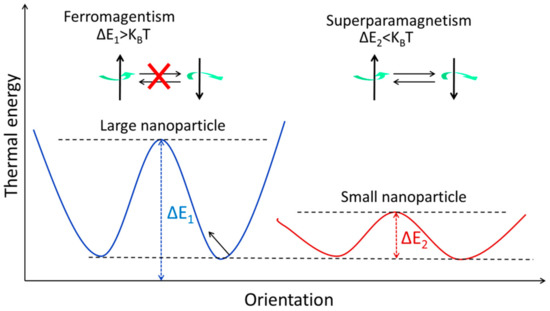 The energy levels of magnetic NPs with varying magnetic spin orientations. When it comes to stopping the magnetization from rotating, thermal energy (KBT) is the limiting factor. Both ferromagnetism and superparamagnetism may be seen in the large and small NPs, respectively.