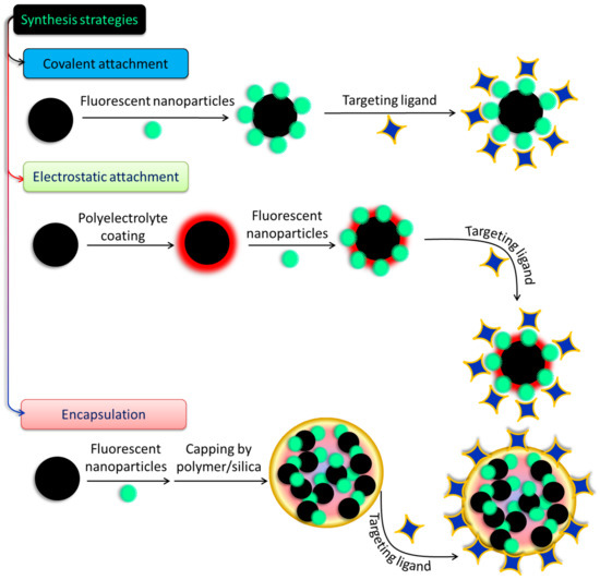 There have been few attempts made to construct hybrid systems, despite the rising interest in and the relevance of SPIONs and SiQDs to the fabrication of biodegradable and biocompatible nanoprobes for biomedical use. Conjugation of the two systems and studies of their conjugated characteristics are scarce, and obstacles such as charge or energy transfer processes and iron oxide’s high absorption in the visible spectrum make even their simple fabrication by quenching QD/SiQDs PL difficult [100]. Long interparticular spacers are usually employed to avoid such disadvantages and ensure the flourishing of both luminous and magnetic characteristics [101]. Covalent binding and electrostatic absorption are used to couple the magnetic and fluorescent species shown in Figure 5 after they have been synthesized and functionalized independently. In this procedure, the coupling strategy for magnetic and fluorescent NPs is determined by the modifications made to their surfaces. Thiol, carboxyl, and amino groups are all examples of functional moieties that may be found in the coupling agents [102]. The formation of core–shell structures on the surfaces of magnetic materials often involves loading fluorescent elements onto the top of a magnetic material by either bond formation or charge attraction. After that, conjugation of specific ligands onto the surfaces of the magneto-fluorescent NPs is often performed. In another method, which is illustrated in Figure 5, the cores of new composite micro- or nanospheres are formed by encasing prefabricated fluorescent NPs and magnetic NPs in various materials, such as silica or polymer beads, protein, chitosan, and liposomes. This results in the formation of new NPs. In order to create these composite nanospheres, two different approaches have been utilized. These materials give the NPs favorable features, such as strong biocompatibility and stability and facile functionalization, to enable the inclusion of ligands so that the NPs may be selectively targeted physiologically. These materials also make the incorporation of ligands easier [103]. Since the existing coupling techniques are straightforward and provide a number of important benefits, a wide variety of magneto-fluorescent NPs have been fabricated and put to use in a variety of subfields of biomedicine. However, the stability of NPs generated in this manner frequently shifts in response to varied settings; as a result, their applications in biomedicine are restricted. When compared to magneto-fluorescent NPs created using the coupling approach, those prepared using the encapsulation method provide a number of benefits, including the ones listed below: