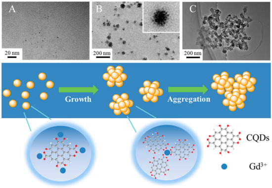 (A) TEM photos of the hydrothermal products after varied incubation durations, including (A) 1 h, (B) 3 h, and (C) 5 h, as well as a schematic illustration of the process of Gd–CQD synthesis [113].