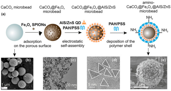 (a) Illustration of multistep synthesis of aminated magneto-fluorescent CaCO3 microbeads and (b–e) SEM and TEM pictures of building blocks: (b) CaCO3 spherical microparticles, (c) Fe3O4 SPIONs capped with PSS, (d) AIS/ZnS QDs stabilized with MPA, and (e) CaCO3@Fe3O4@AIS/ZnS microbeads containing amino surface groups for further bioconjugation [158].