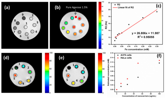 MRI (a) with a T2 weighting and (b) with a T2 map (ms) superimposed in color. MFCSNPs-FA-CHI-5FU nanocarrier concentrations are shown in part as numbers (1–9) that correspond to areas representing miniature phantom tubes. (c) Different concentrations of MFCSNPs in agarose (1.5%) were used to create phantoms, as detailed in the Experimental section. Fe concentration against R2 plot for MFCSNPs-FA-CHI-5FU nanocarriers (red line represents a linear fitting). MRI scans with color overlays of (d) A375 and (e) HeLa cells. Small phantom tubes containing A375 and HeLa cells were treated with varying quantities of MFCSNPs-FA-CHI-5FU nanocarriers (0–200 g/mL), as shown by the numbers (0 refers to cells only and 2–6 correspond to various concentrations of nanocarriers (0–200 g/mL)). (f) A concentration vs. relaxivity plot of nanocarriers incubated with cancer cells, with the y-axis representing the estimated concentration of internalized nanocarriers.