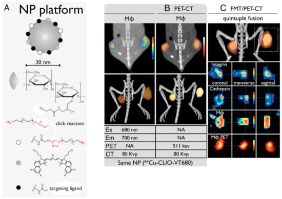 Nanoparticle-based multimodality PET imaging. (A) The broad range of targeted ligands that may be conjugated to CLIO, including, but not limited, to 18F through click chemistry and peptides. Tumor-bearing mice were coinjected with a fluorescent peptide against integrins, a fluorescent cathepsin sensor, and 64Cu-CLIO-VT680, and then subjected to in vivo multichannel PET-CT (B) and FMT/PET-CT (C) [163].