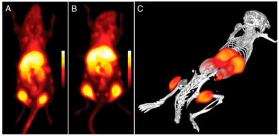 Imaging using 89Zr-labeled DNPs using PET in mice with bilateral flank tumors (24 h after administration). (A,B) Two distinct animals with almost identical tumor distributions (coronal stacks). Panel A depicts an animal; panel (C) depicts a three-dimensional model of the animal [167].
