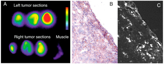 Imaging using 18F-CLIO PET-CT revealed considerably increased PET signals in murine aortic aneurysms compared to normal aortas, likely because 18F-CLIO targeted monocytes and macrophages within the aneurysm [164]. Radionuclide, fluorescent, histologic, and flow cytometric tests all corroborated the cellular probe distribution. Presently, risk indicators, such as aneurysm diameter, gathered from the community are used to determine whether or not the surgical excision of an aneurysm is warranted. Therapeutic choices might be made on an individual basis using nanoparticle-PET agent conjugates in response to molecular illness indicators, such as cellular inflammatory activity in the aneurysm. Using PET for in vivo imaging of leukocytes enables researchers in the field of immunology to monitor the selective recruitment of particular immune cells at various points in the pathogenesis of an illness, locate infectious or inflammatory hotspots, and create evidence-based therapy plans [165]. The use of CNs for 89Zr leukocyte labeling for PET imaging of inflammation was described by Fairclough et al. [166]. The purpose of this research was to perfect the process of labeling leukocytes by enhancing the CN preparation for maximum 89Zr-loading and cell uptake. The effectiveness of cell uptake has been studied with respect to the nanoparticles’ size and surface charge. The absorption and retention of 89Zr-loaded CNs in mixed human leukocyte cells, as well as CNs’ affinity for 89Zr, have been studied. A novel technique for radiolabeling white blood cells with zirconium-89 (89Zr) or copper-64 (64Cu) for PET imaging was assessed. Ionotropic gelation was employed to create chitosan nanoparticles (CNs) that were then used to transport radiometals into white blood cells. Using the same 89Zr-labeled DNPs described previously, Keliher et al. performed PET-CT imaging in a mouse model of cancer. On account of its popularity for studying tumor infiltrating host cells, a syngeneic colon cancer (CT26) mouse model was employed [167]. Images from a variety of xenografted animals are shown in Figure 13. In certain animals, the concentration of RES in tumors was higher than in any other organ of the reticuloendothelial system, which was an unexpected finding. Through thorough correlative histology and flow cytometry experiments, we were able to ascertain whether tumoral accumulation was the result of cellular uptake or extraversion and interstitial accumulation. After removing tumors, we cut them into thin slices (1 mm) and used autoradiography to image them next to slides stained with Mac-3 (a stain that identifies macrophages). All in all, the “hot areas” and the Mac3 optimism across the chapters were in accord (Figure 13). Histological examination revealed selective uptake of fluorescent DNPs by Mac3+ cells and a general lack of absorption by Mac3 cells (Figure 14).