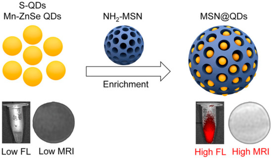 - Zhou, R.; Sun, S.; Li, C.; Wu, L.; Hou, X.; Wu, P. Enriching Mn-doped ZnSe quantum dots onto mesoporous silica nanoparticles for enhanced fluorescence/magnetic resonance imaging dual-modal bio-imaging. ACS Appl. Mater. Interfaces 2018, 10, 34060–34067. [Google Scholar] [CrossRef] [PubMed]