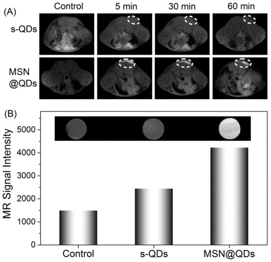 Comparison of pre- and post-injection MR images of a Balb/c mouse injected with s-QDs and MSN@QDs: MR coronal pictures at T1 weighting (A) and the associated MR signal intensity (B) as measured in vitro [176].