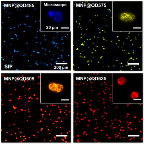 Smartphone (main images, scale bar = 200 m) and microscope (insets, scale bar = 20 m) images of fixed SK-BR3 cells isolated with MNP@QDs of different colors: QD485, QD575, QD605, and QD635. The notation for the QDs indicates the QDs’ peak PL emission wavelengths. The smartphone pictures were taken in RGB color format. The microscope images were given “false colors” based on the monochrome intensity values [183].